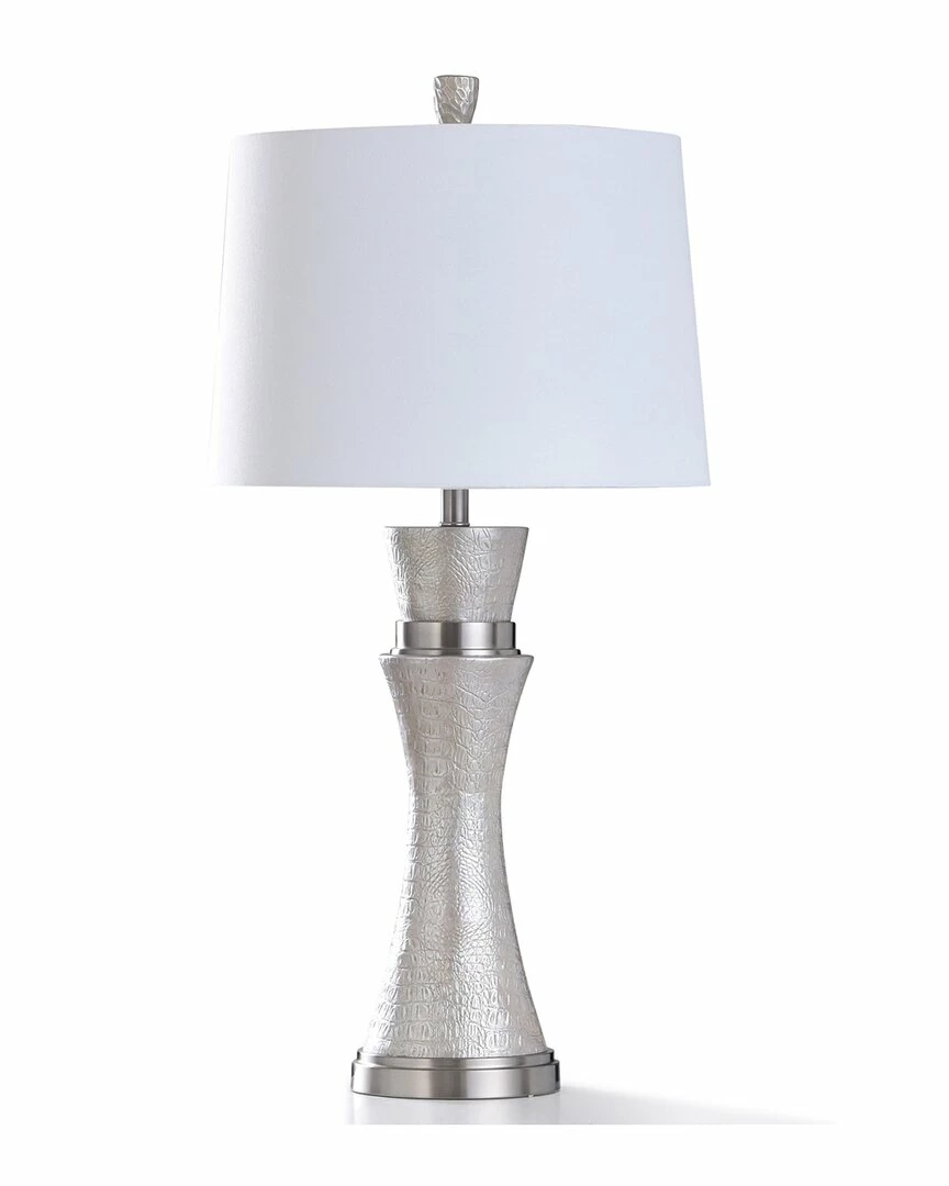 - Give any room the perfect transitional style with this pearl and brushed steel Aglona table lamp. Whether you put it in a bedroom, living room, hallway, or foyer, this lamp will make a stunning focal point thanks to its resin pillar design with brushed steel metal accents and base. There is also a gorgeous matching finial, hardback white linen shade, and 3-way switch to pull this stunning design element together.