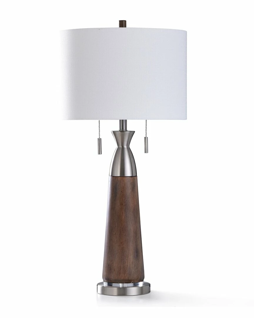 - This painted wood Allerton table lamp is designed to embody a chic modern style. It features a gorgeous transitional vintage-inspired brushed steel metal and warm wood body delicately sloping into a stylish white drum hardback shade. This elegant double pull chain lighting fixture will instantly elevate any bedroom, office or foyer to a whole new level.