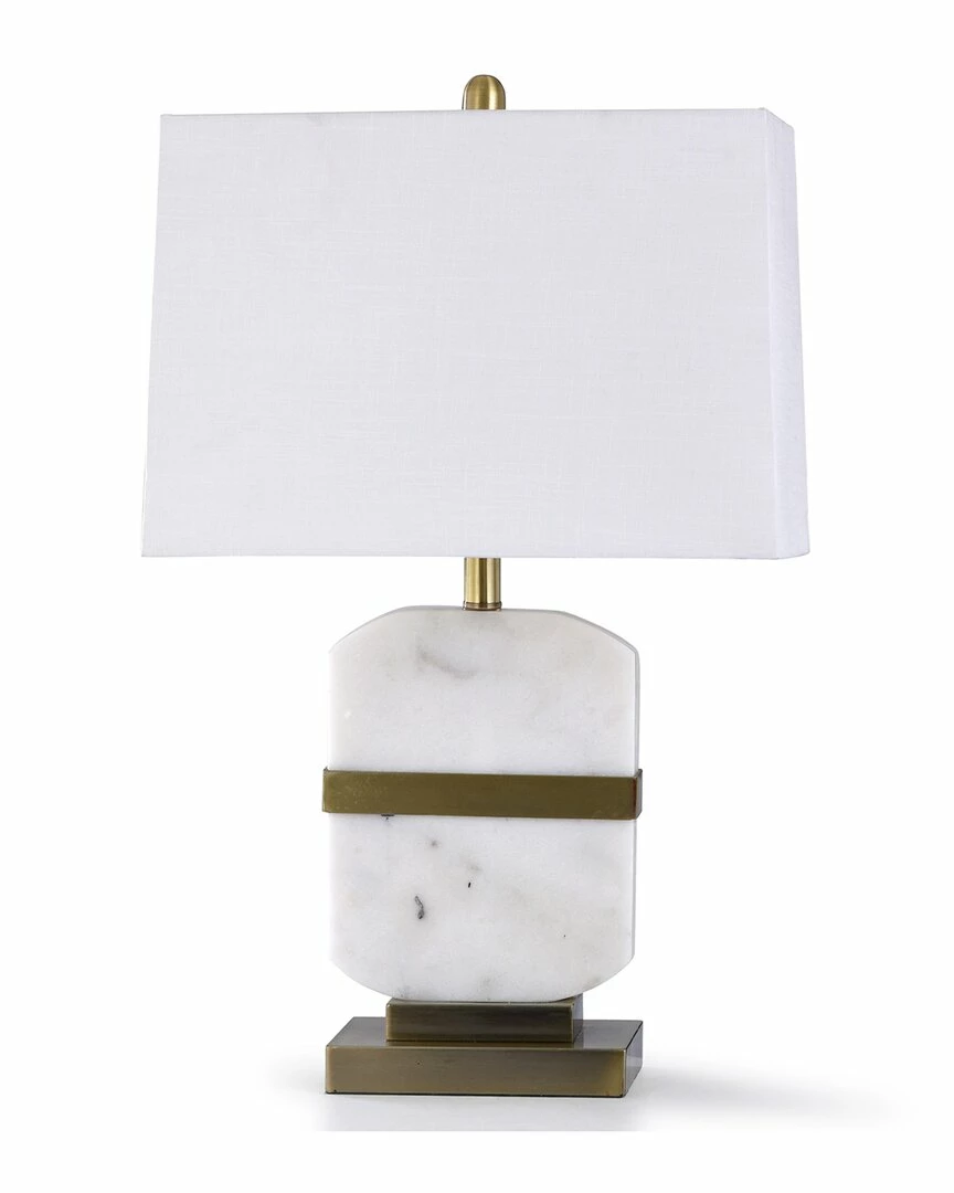 - Add to your home’s contemporary beauty by purchasing this white and gold Arabescato table lamp. With its combination of white Carrara marble and gold steel metal bands to hold the marble in place, the lamp is truly the superior lighting accessory for any bedroom, living room, foyer or hallway. Not only does it make for a stunning focal point, the 3-way switch means your space will always be flooded with the perfect amount of ambient light.