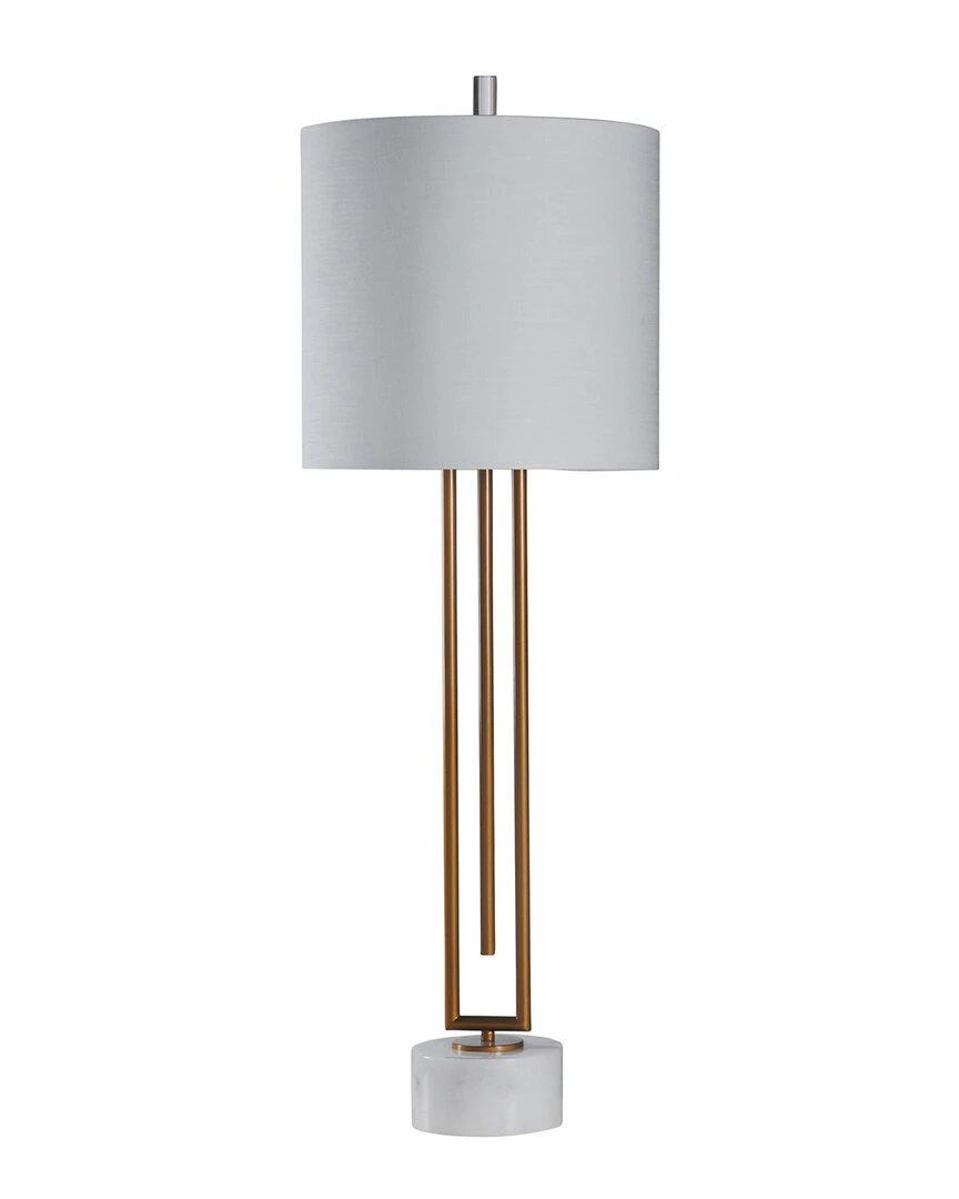 - Take your home back in time with this bronze and white marble Bardot buffet lamp. Its bronze steel and white marble body delivers a mid-century appeal that fits perfectly with its hardback white linen shade. This lamp’s understated elegance makes it the perfect addition to any bedroom, living room, hallway, office or foyer. There is also a 3-way switch, which helps ensure your space will always be flooded with the perfect amount of ambient light.
