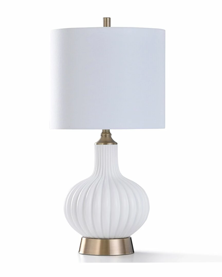- Brighten up your life with this white and gold Billingham table lamp. No matter which room you plan to put it in, the white ribbed gourd-shaped glass body and brushed brass metal base and neck will make it a stunning focal point. The classic, yet refined style is the signature calling card of the coveted William Mangum Collection.