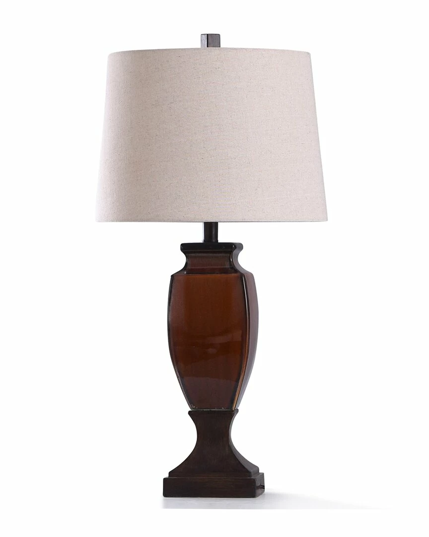 - This delightful bronze tapered Brackley table lamp seamlessly walks the line between old-school elegance and contemporary sensibility. It features a sublime high-gloss glaze dark amber ceramic body that adds elegant contrast to the painted bronze based and chic white hardback shade. The perfect piece to lend some warm lighting to any modern design scheme, it is versatile enough for the bedroom, hallway, office and living room alike.