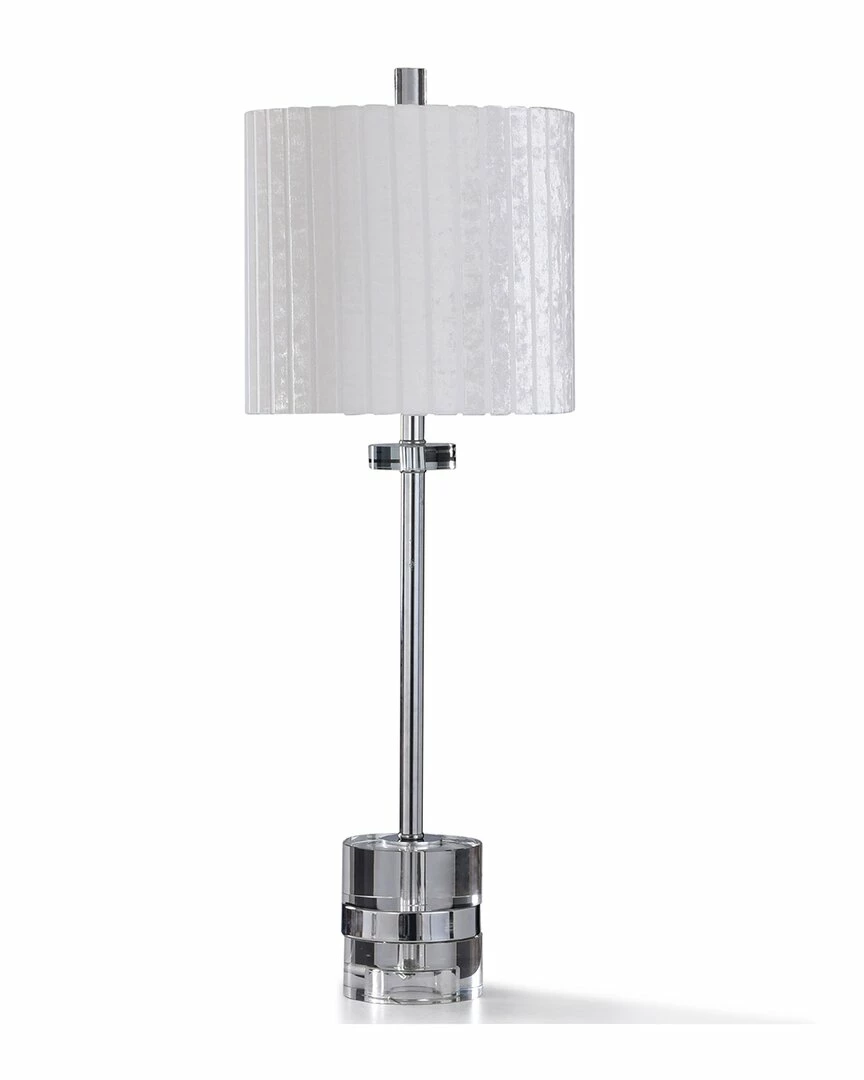 - Immaculate and minimal, this transitional chrome metal Cascade silver table lamp combines clear crystal and glass elements with a simple and soft design. The velvet-white hardback shade is lavishly pleated. The rich textures of this transitional lamp make it a perfect addition to a bedroom, living room, office, or hallway.