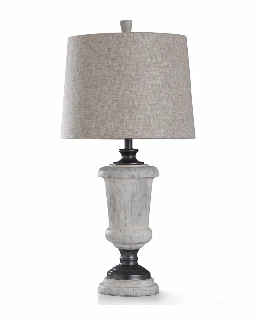 - Introduce a splash of beauty to your office, bedroom, hallway, or living room with this light gray stone and gunmetal Cinderford table lamp. The traditional Colonial stone style uses gunmetal finished accents, a matching finial, and a hardback beige linen shade. Plus, there is a 3-way switch to help ensure your space will always be flooded with the perfect amount of ambient light.
