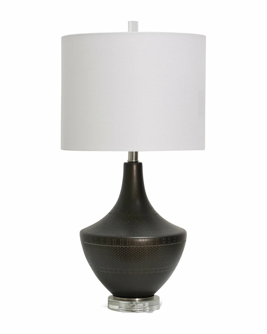 - The decadent dark bronze table lamp oozes style and sophistication. The bold globe-shaped metallic body offers a stunning contrast to a gorgeous clean acrylic base, ensuring that this hardback shade drum lamp will add a splash of dramatic elegance to complement almost any style. This chic contemporary three-way lighting fixture is the perfect addition to any bedroom, office, hallway or living area.