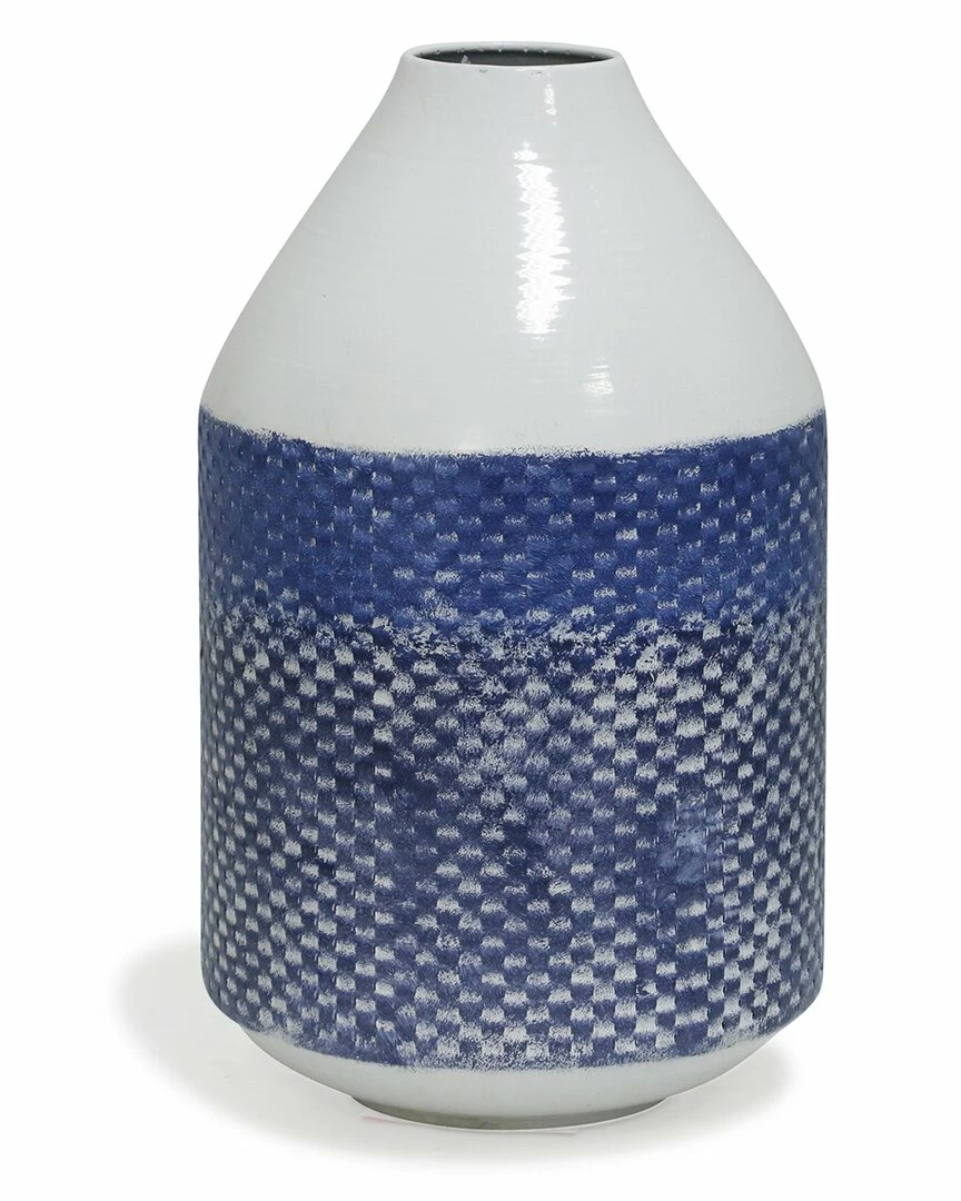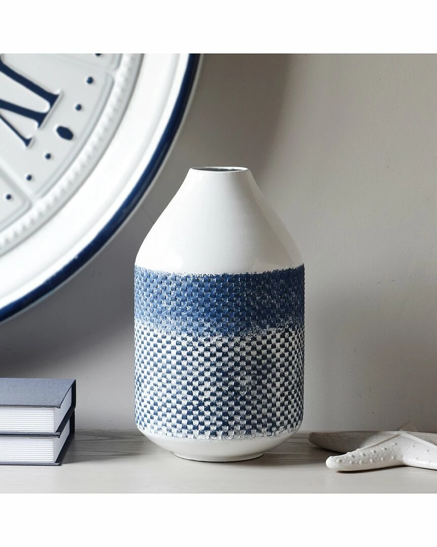 - Design details: the classic white and blue distress finish on this medium-height metal vase from the cree collection ensures it’s the perfect complement to traditional decor. this cylindrical checkered metal vase is made of iron and features a wide round base and tapered mouth. the blue geometric pattern around the base is highlighted by the glossy white top. a stunning accent piece, this vase can brighten up any living room, hallway, dining room, foyer, or bedroom. / blue checkered metal vase / cannot hold water