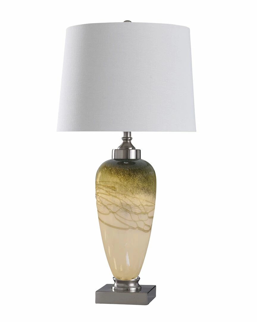 - Improve your living room, office, bedroom, or hallway with this white glass and chrome Elstree table lamp. Its glass body incorporates silver and white with a chrome metal base to make it a stunning focal point. The matching finial, white linen shade, and LED night light in the base further enhance its visual appeal. Plus, the 4-way switch helps ensure your space will always be flooded with the perfect amount of ambient light.