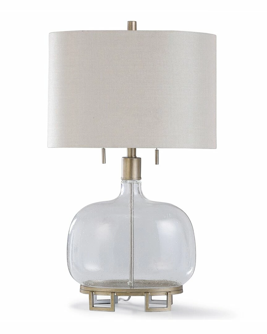 - Inject some subtle elegance into your space with this clear glass and silver steel Helston Gold table lamp. The clear glass body is supported by an ornate steel four square-legged base. The look is completed with a matching finial and pristine hardback off-white linen shade. There is also a double pull chain to add to its transitional beauty and make it perfect for any bedroom, living room, office, or hallway.