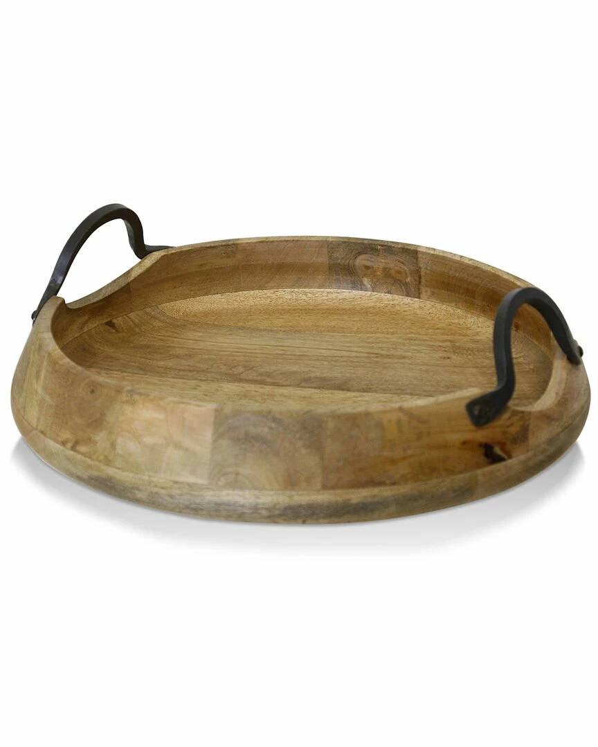 - Design details: rethink your home decor possibilities with the stylecraft kiran natural wood with iron metal decorative tray. this beautiful tray is made from solid wood and is equipped with iron metal handles. this decorative wooden tray is perfect for a shelf, mantle or side table setting. / due to the production process, each piece is unique and no two are exactly alike. / decorative wooden tray is composed out of solid wood and has iron metal handles.