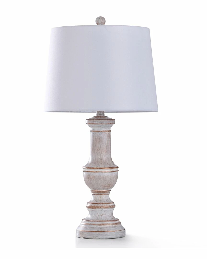 - Perfect for living room side tables, this wide, baluster-style Malta table lamp has a whitewash finish. The layered detailing on the base creates the illusion of height while remaining humble and clean. Elegant and refined, this lamp is made from poly resin which is artfully offset by a hardback made of white linen.