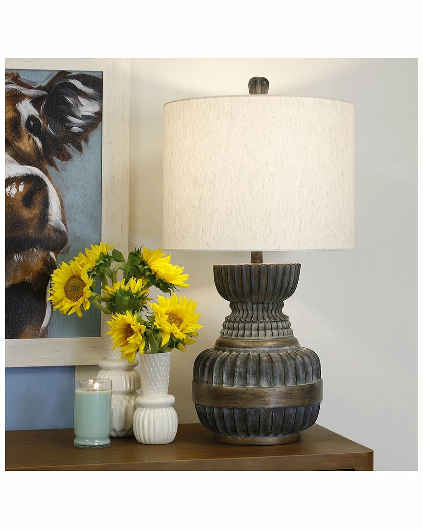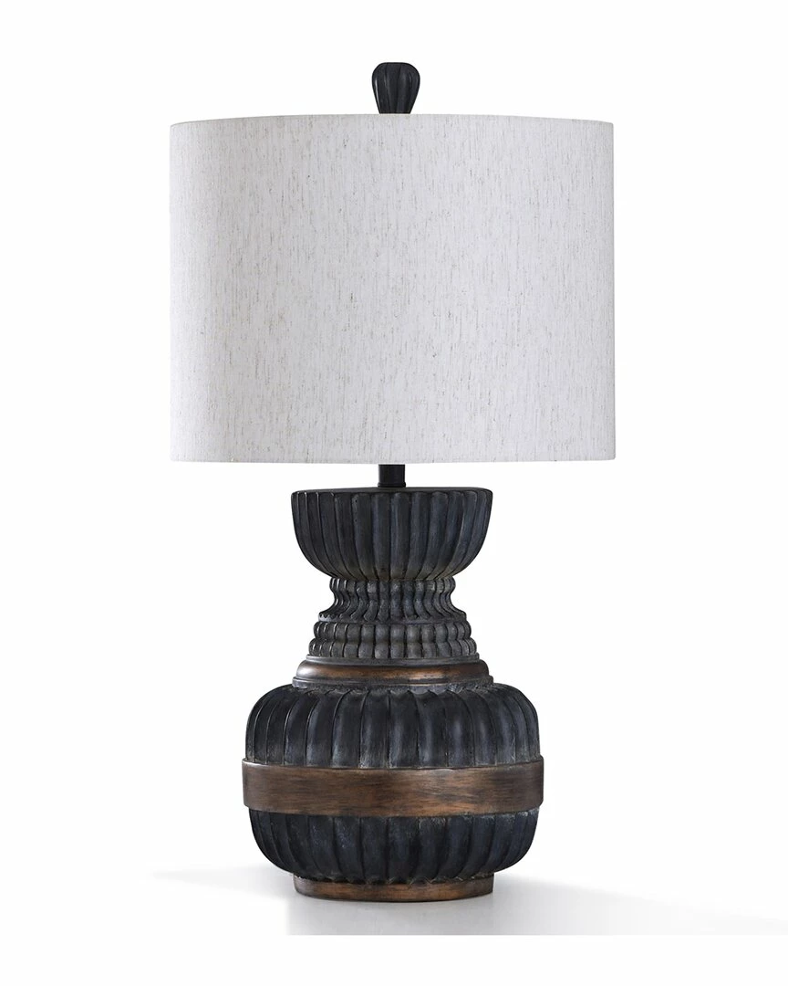 - This show-stopping drum Malta table lamp is a standalone piece that will bring any bedroom, hallway or living room area to life. It features an eye-catching vintage-inspired traditional wave and banded body that lends the perfect degree of contrast to a chic white hardback shade. The unique antique bronze and faded ebony finish have mid-century modern style aficionados swooning while the soft warm glow will add a touch of understated ambiance.