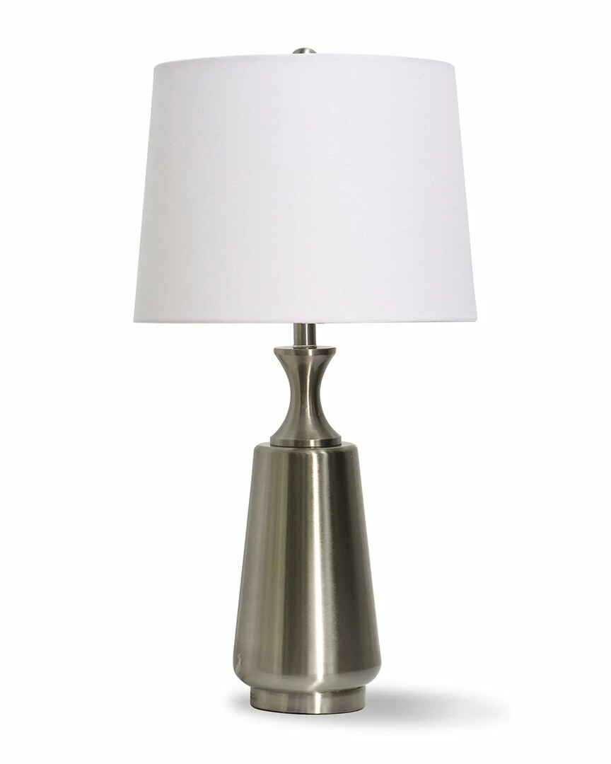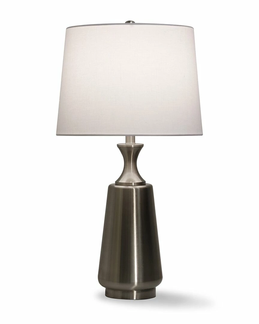 - Steel Table Lamp – Brushed Steel and Clear Acrylic – White / Heathered Oatmeal Shade. Inject some contemporary style into your home with this unique brushed steel and acrylic Silver Leaf table lamp. The distinctive beauty of the brushed steel and clear acrylic body along with the heather oatmeal hardback linen shade make this lamp the perfect addition to any bedroom, living room, office, or hallway. And with the 3-way switch, you can ensure your space will always be flooded with the perfect amount of ambient light. Silver Leaf Contemporary Steel and Acrylic Table Lamp. Hardback shade. Matching finial