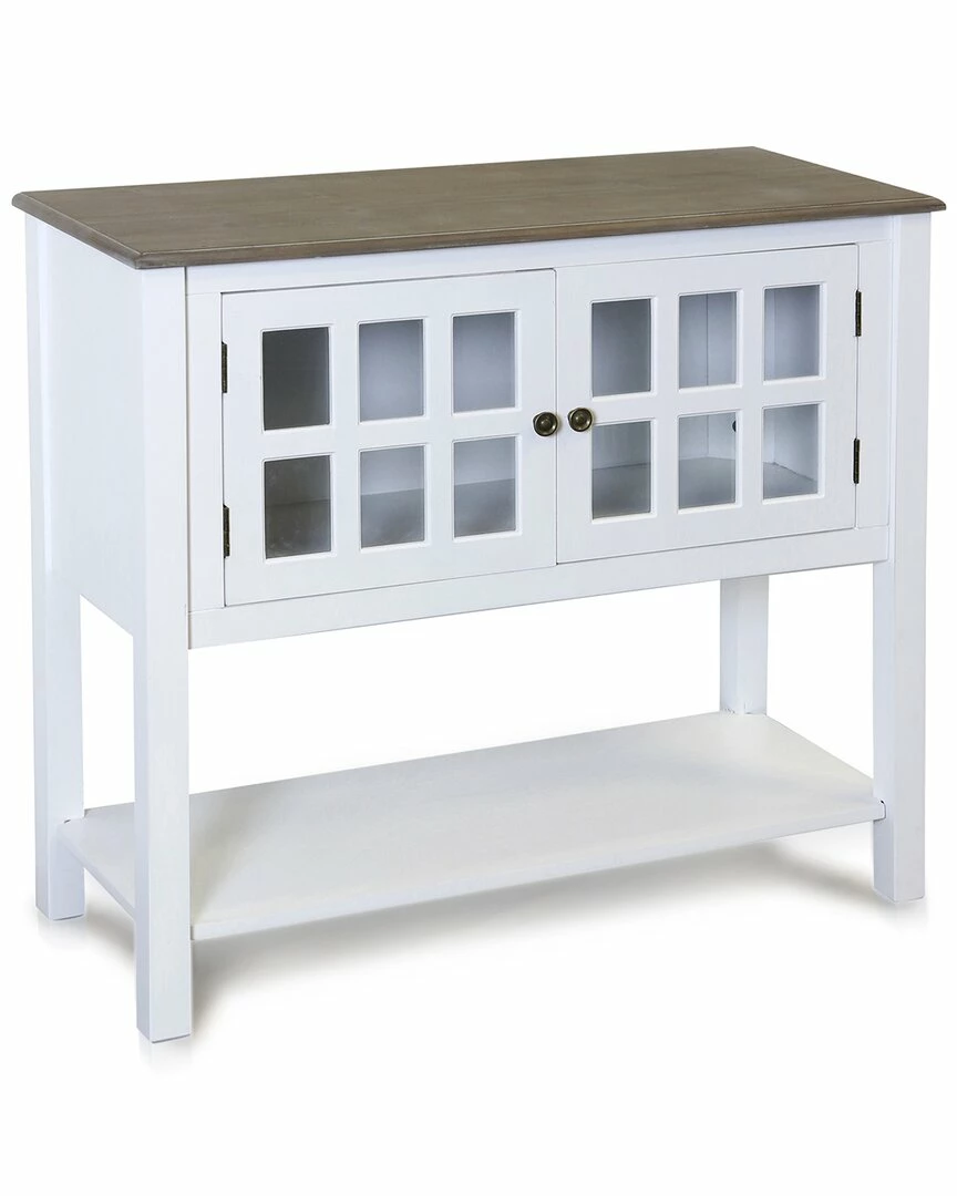 - Revitalize the look of your finished basement or living room space with the Two Door Wooden Console with Glass Front. This stylish console cabinet features two doors with glass window pains, allowing for ample storage space. This indoor table also includes a lower shelf, allowing you to stack and store assorted decor pieces. Due to the production process, each piece is unique and no two are exactly alike. Console table has two doors with glass window pane fronts. Console table has a white finish on base, legs, bottom shelf, and inner compartments. console table top is finished with a natural wood finish. The cabinet has a bottom open shelf. The cabinet requires minimal assembly.