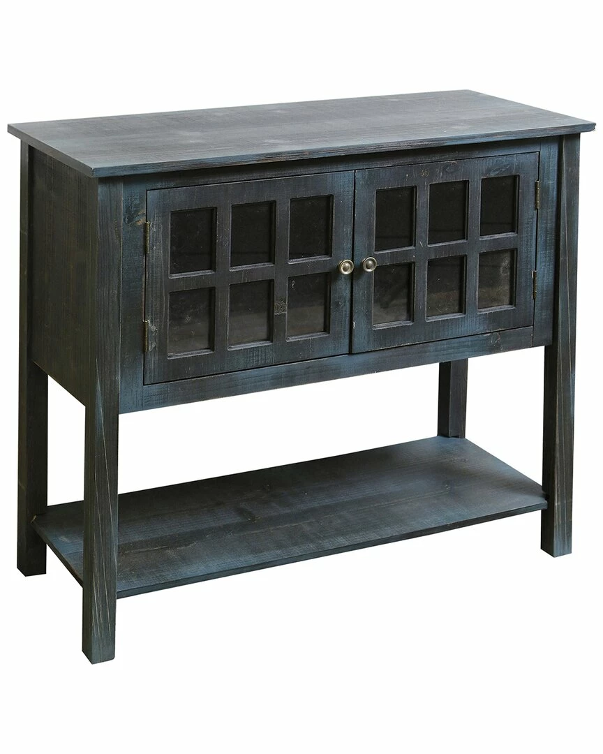 - Revitalize the look of your finished basement or living room space with the Two Door Wooden Console with Glass Front. This stylish console cabinet features two doors with glass window pains, allowing for ample storage space. This indoor table also includes a lower shelf, allowing you to stack and store assorted decor pieces. Due to the production process, each piece is unique and no two are exactly alike. Console table has two doors with glass window pane fronts. Console table has a rustic teal finish. The cabinet has a bottom open shelf. The cabinet requires minimal assembly.